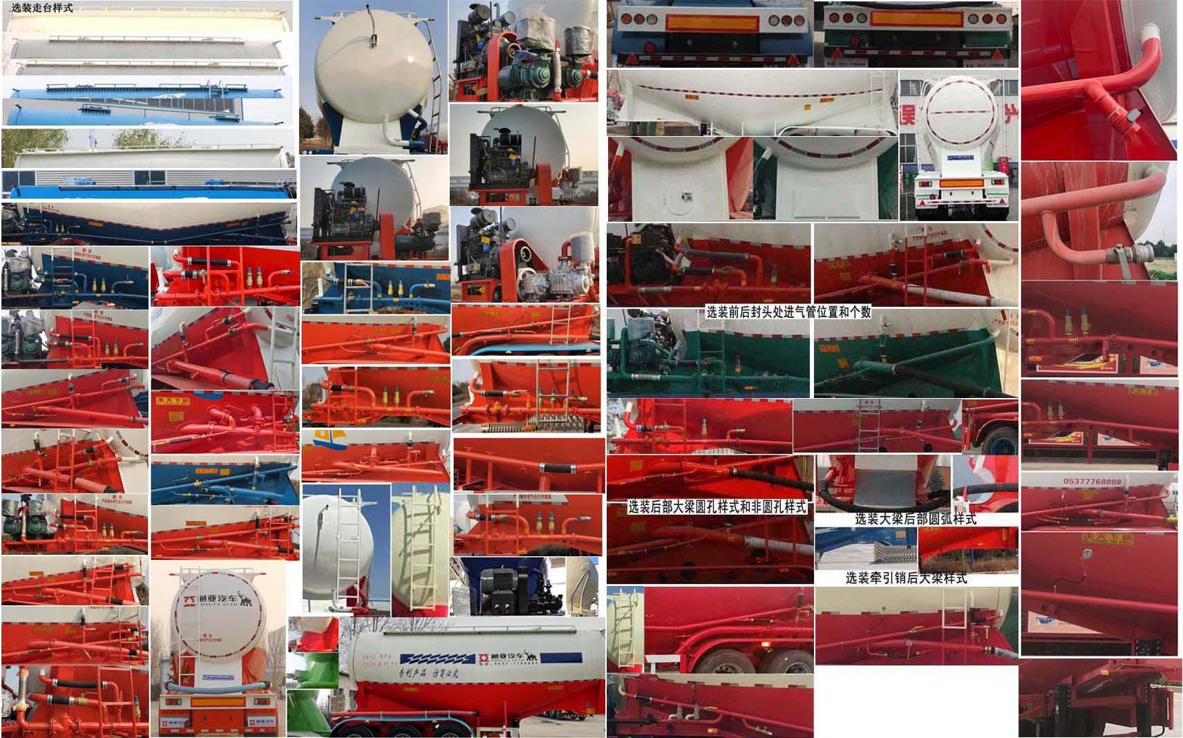 | 备注 | 罐体有效容积为:28.3立方米,运输介质:固井专用水泥,介质堆密度:1200千克/立方米,罐体尺寸(含封头)长:9130mm,最大截面宽度:2490mm,最大截面高度:2900mm,前后封头直径:2010mm;选装车辆前部不加装机组,不带机组时外形尺寸为(mm):9250×2500×3990,选装爬梯的安装个数和位置及轮罩样式,罐体外形样式,空气悬挂,选装灯具型号及后组合灯所在部件的样式;车长为10000mm时,轴距为;5150+1310+1310,5000+1310+1310,前悬/后悬:-/880;车长为9250mm时,轴距为;5150+1310+1310,5000+1310+1310,前悬/后悬:-/880;ABS系统生产厂家:威伯科汽车控制系统(中国)有限公司,广州瑞立科密汽车电子股份有限公司,梁山顺安达汽车科技有限公司,型号:4005000810 4S2M,CM2XL-4S/2K(4S/2M),SAD-ABS4S/2M;侧面及后下部防护装置所用材料材质为:Q235,侧面及后下部防护装置与车辆连接方式均为:螺栓连接或焊接,后部防护装置的主要尺寸参数:断面尺寸(mm)为120×68,离地高度为:500mm.后部不可开启,顶部封闭不可开槽. 选装大梁后部可以为弧形,选装爬梯的安装位置可以在罐体左侧前部或后部或罐体后部,爬梯个数可以为一个或两个或三个,选装轮罩样式及铝合金轮毂,选装走台样式,选装罐顶升降护栏,顶部可为挡水槽式也可为走台式,选装前后封头处进气管位置和个数,工具箱位置可选装,选装罐盖个数及位置,选装大梁可以钻孔,选装罐体罐道的样式,选装后部大梁堵板样式,选装下出灰管道样式. | ||