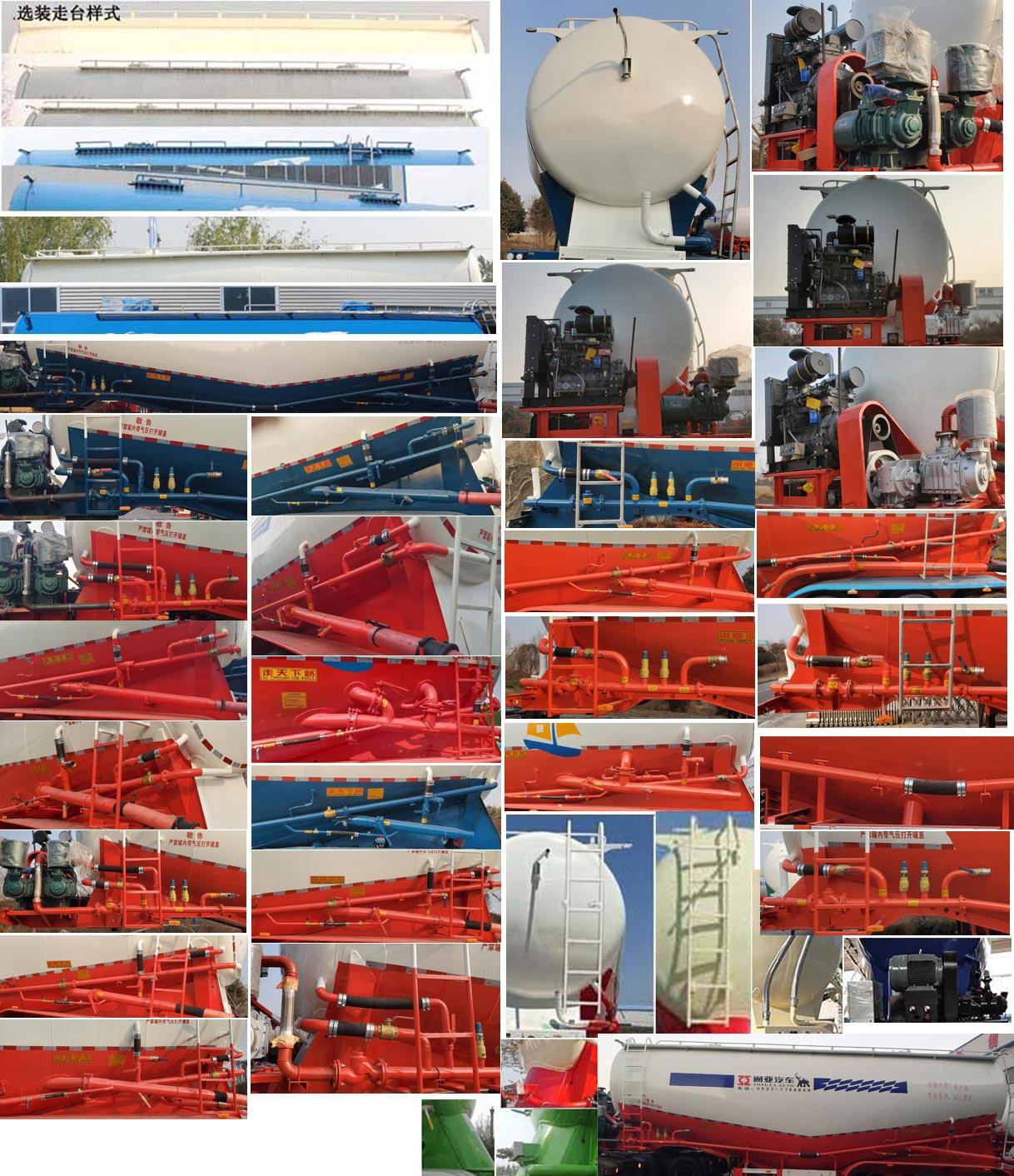 | 其它 | 顶部封闭不可开槽,后部不可开启;罐体总容量:63.6立方米,罐体有效容积:60.6立方米,罐体外形尺寸A型:罐体长(含封头)13000mm,最大截面处宽2550mm,最大截面处高3420mm,前后封头直径为2010mm;罐体外形尺寸B型:罐体长(含封头)12680mm,最大截面处宽2550mm,最大截面处高3420mm,前后封头直径为2010mm;选装双助吹样式,选装支腿连接件样式,选装外接气源样式,选装压力表安装位置,选装车辆前部不加装机组,选装前位灯及前回复反射器所在部件的样式;选装后组合灯为矩形样式,选装爬梯安装位置(前部/后部/侧面)及个数(一个/两个/三个),选装前后封头处进气管位置和个数,选装后部大梁圆孔样式和非圆孔样式,选装大梁后部圆弧样式,选装牵引销后大梁样式,选装后部大梁堵板样式,选装机组样式,选装部件位置因为制造误差可有小变化,选装尾部标志板安装位置,选装号牌板安装位置;ABS系统生产厂家:广州瑞立科密汽车电子股份有限公司,梁山顺安达汽车科技有限公司,广州市西合汽车电子装备有限公司,山东梁山德尔福汽车科技有限公司,型号:CM2XL-4S/2M,SAD-ABS4S/2M,XH-GQ4S2M-E01,DEF-ABS4S/3M;侧面及后下部防护装置所用材料材质为:Q235,侧面及后下部防护装置与车辆连接方式均为:螺栓连接或焊接,后部防护装置的主要尺寸参数:断面尺寸(mm)为120×68,离地高度为:500mm. | ||