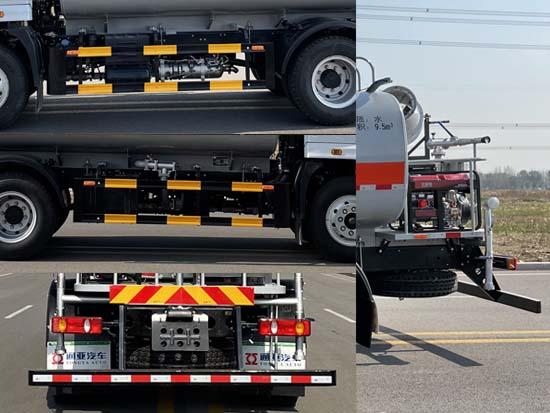 | 其它 | 装备有罐体和喷洒系统,用于园林绿化喷洒作业.介质:水,罐体总容量:10立方米,罐体有效容积为9.5立方米,罐体尺寸(长×长轴×短轴)(mm):4100×2400×1450;仅采用3950mm轴距;选装装饰管,选装前鸭嘴,选装箭头灯,选装不加装雾炮;侧后防护装置材料均为:Q235B,侧后防护装置与车架连接方式均为螺栓连接,后防护装置截面尺寸为:120×68mm,后防护装置离地高度480mm,ABS型号为J ABS,生产厂家为焦作博瑞克控制技术有限公司. | ||