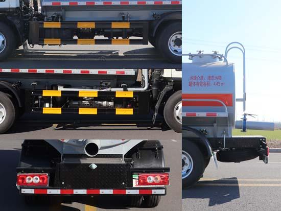 | 其它 | 该车专用装置为罐体,用于粪便、污液、泥浆等液态污物的收集和清理作业;仅采用3360mm轴距;运输介质:液态污物,罐体总容量:4.6立方米,罐体有效容积:4.45立方米;罐体截面形状:罐体尺寸(长×长轴×短轴)(mm):3400×1650×1200;侧后防护装置材料均为:Q235B,侧后防护装置与车架连接方式均为螺栓连接,后防护装置截面尺寸为:100×50mm,离地高度420mm;ABS型号及生产厂家:CM4XL-4S/4M/广州瑞立科密汽车电子股份有限公司; | ||