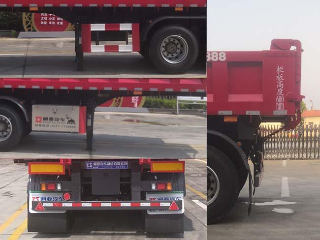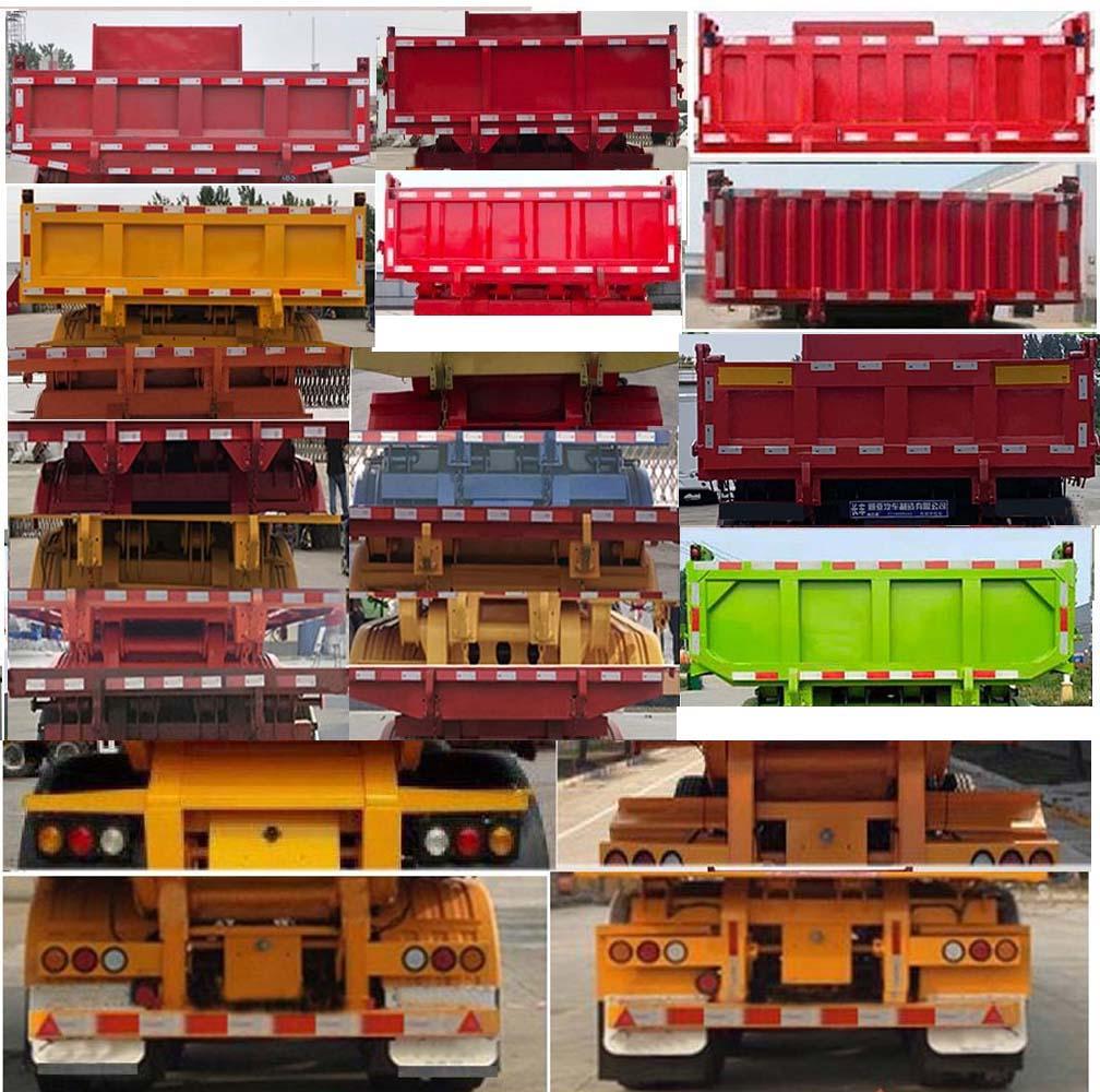 其它卸货方式为:后卸;安装有手动锁紧机构;选装后部灯具样式,选装后翻转支架,选装后部栏板样式,选装前档样式,选装侧面样式,选装号牌板样式,选装液压油箱安装位置,选装尾部标志板安装位置,选装大梁后部挡板为钻孔样式;ABS系统生产厂家:广州瑞立科密汽车电子股份有限公司,广州市西合汽车电子装备有限公司,山东梁山德尔福汽车科技有限公司,型号:CM2XL-4S/2M,XH-GQ4S2M-E01,DEF-ABS 4S/3M;侧面及后下部防护装置所用材料材质为:Q235B,侧面防护装置与车辆连接方式为螺栓连接,后下部防护装置与车辆连接方式为焊接,后部防护装置的主要尺寸参数:断面尺寸(mm)为140×50,离地高度为:490mm;车长/牵引销到车辆最前端距离/轴距/后悬对应关系为:9500/1000/4540+1310+1310/1340,9000/900/4290+1310+1310/1190,8700/850/4150+1310+1310/1080.