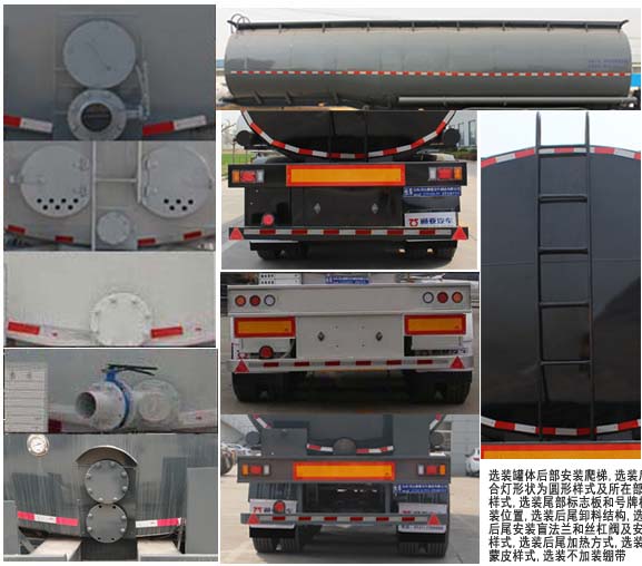 | 备注 | 该车为非危化品运输车辆,不能运输危化品.罐体有效容积:34.5立方米,允许运输介质的最大密度为:900千克/立方米,罐体为鹅颈式,该车加装保温层,保温层厚度为50mm和80mm两种,当外形尺寸长(mm)为:10400时,保温层内部罐体外形尺寸型为(mm):长9800,宽2350,前端高1900,后端高2080,;当外形尺寸长(mm)为:9800时,保温层内部罐体外形尺寸型为(mm):长9300,宽2350,前端高1900,后端高2080;ABS系统生产厂家:广州瑞立科密汽车电子股份有限公司,梁山顺安达汽车科技有限公司,广州市西合汽车电子装备有限公司,山东梁山德尔福汽车科技有限公司,型号:CM2XL-4S/2M,SAD-ABS4S/2M,XH-GQ4S2M-E01,DEF-ABS4S/3M;侧面及后下部防护装置所用材料材质均为:Q235,侧面防护装置与车辆连接方式为:螺栓连接,后下部防护装置与车辆连接方式为:焊接,后部防护装置的主要尺寸参数:断面尺寸(mm)为120×68,离地高度为:500mm;选装阀门箱及个数(一个或两个),选装罐顶升降护栏,选装罐体后部安装爬梯,选装后组合灯形状为圆形样式及所在部件样式,选装尾部标志板和号牌板安装位置,选装后尾卸料结构,选装后尾安装盲法兰和丝杠阀及安装样式,选装后尾加热方式,选装外蒙皮样式,选装不加装绷带,选装走台样式,选装罐口位置,选装外观样式,选装后尾加装炉个数;车长/牵引销到车辆最前端距离/轴距/后悬的对应关系为:9800/1200/4630+1310+1310/1350,10400/1400/4930+1310+1310/1450,10400/1250/5080+1310+1310/1450. | ||