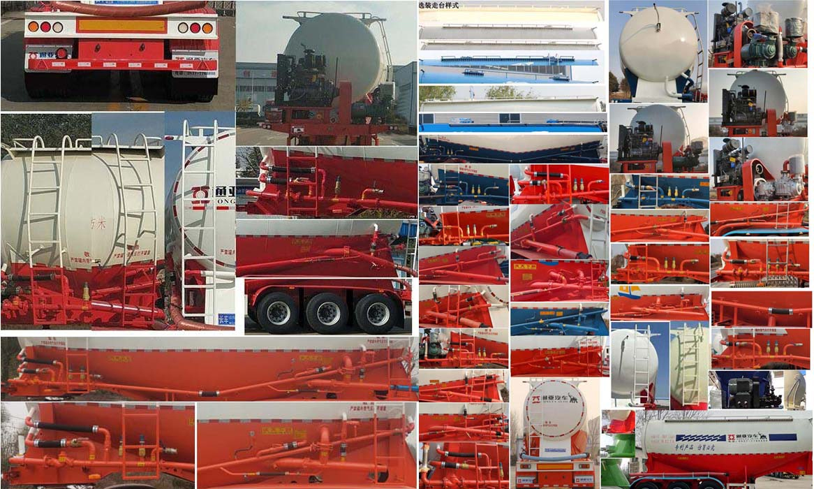 顶部封闭不可开槽,后部不可开启;罐体总容量:28立方米,罐体有效容积:26.9立方米,运输介质:固井专用水泥;罐体尺寸长(含封头)9330mm,最大截面处宽2538mm,最大截面处高2900mm,前后封头直径为2008mm,选装罐体尺寸长(含封头)9030mm,最大截面处宽2538mm,最大截面处高2990mm,前后封头直径为2008mm;当轮胎型号为11R22.5 14PR时,轮胎中间加装雨帘;选装车辆前部加装机组,选装走台样式,选装后组合灯为圆形样式,选装爬梯安装位置(前面/侧面/后面)及个数(一个/两个/三个),选装前后封头处进气管位置和个数,选装大梁圆孔样式和非圆孔样式,选装大梁后部圆弧样式,选装牵引销后大梁样式,选装罐道样式,选装下出料样式,选装后尾小工具箱样式;ABS系统生产厂家:广州瑞立科密汽车电子股份有限公司,广州市西合汽车电子装备有限公司,型号:CM2XL-4S/2M,XH-GQ4S2M-E01;侧面及后下部防护装置所用材料材质为:Q235,侧面及后下部防护装置与车辆连接方式均为:螺栓连接或焊接,后部防护装置的主要尺寸参数:断面尺寸(mm)为120×68,离地高度为:500mm;车长/牵引销到车辆最前端距离/轴距/后悬对应关系为:9980/1280/5250+1310+1310/830,9980/1380/5150+1310+1310/830,9980/1330/5150+1310+1310/880,9980/1430/5050+1310+1310/880,9400/750/5150+1310+1310/880,9400/700/5250+1310+1310/830,9400/650/5300+1310+1310/830,9100/600/5050+1310+1310/830,9100/500/5150+1310+1310/830,9100/550/5050+1310+1310/880.