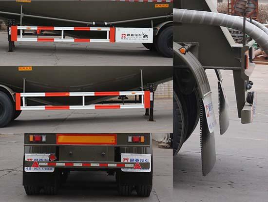 | 其它 | 顶部封闭不可开槽,后部不可开启;罐体总容量:63.6立方米,罐体有效容积:60.6立方米,罐体外形尺寸A型:罐体长(含封头)13000mm,最大截面处宽2550mm,最大截面处高3420mm,前后封头直径为2010mm;罐体外形尺寸B型:罐体长(含封头)12680mm,最大截面处宽2550mm,最大截面处高3420mm,前后封头直径为2010mm;选装双助吹样式,选装支腿连接件样式,选装外接气源样式,选装压力表安装位置,选装车辆前部不加装机组,选装前位灯及前回复反射器所在部件的样式;选装后组合灯为矩形样式,选装爬梯安装位置(前部/后部/侧面)及个数(一个/两个/三个),选装前后封头处进气管位置和个数,选装后部大梁圆孔样式和非圆孔样式,选装大梁后部圆弧样式,选装牵引销后大梁样式,选装后部大梁堵板样式,选装机组样式,选装部件位置因为制造误差可有小变化,选装尾部标志板安装位置,选装号牌板安装位置;ABS系统生产厂家:广州瑞立科密汽车电子股份有限公司,梁山顺安达汽车科技有限公司,广州市西合汽车电子装备有限公司,山东梁山德尔福汽车科技有限公司,型号:CM2XL-4S/2M,SAD-ABS4S/2M,XH-GQ4S2M-E01,DEF-ABS4S/3M;侧面及后下部防护装置所用材料材质为:Q235,侧面及后下部防护装置与车辆连接方式均为:螺栓连接或焊接,后部防护装置的主要尺寸参数:断面尺寸(mm)为120×68,离地高度为:500mm. | ||