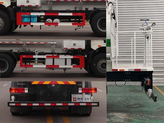 | 其它 | 加装罐体及清洗装置,用于清理路面或管道沉积物或清洗机械表面;仅采用轴距为:4350+1350mm,选装前高压冲洗装置时,前伸为920mm,整备质量为:11370kg,罐体有效容积为13.4立方米,罐体尺寸(长×长轴×短轴)(mm):5800×2290×1590;整备质量为:10585kg时,罐体有效容积为14.2立方米,罐体尺寸(长×长轴×短轴)(mm):6000×2290×1550;选装后部加装圆形指示灯或箭头指示灯,选装两种指示灯安装一种或两种同时安装,选装加装后上部喷雾杆,选装后部加装喷雾机装置,侧后防护装置材料均为:Q235B,侧防护装置与车架连接方式为螺栓连接;后防护装置与车架连接方式为焊接,后防护装置截面尺寸为:120×68mm,离地高度480mm;ABS生产厂家:1.长春瑞立科密汽车电子有限公司,型号:CM4XL.ABS生产厂家:2.威伯科汽车控制系统(中国)有限公司,型号:ABS-E.装备限速装置,限速89km/h. | ||